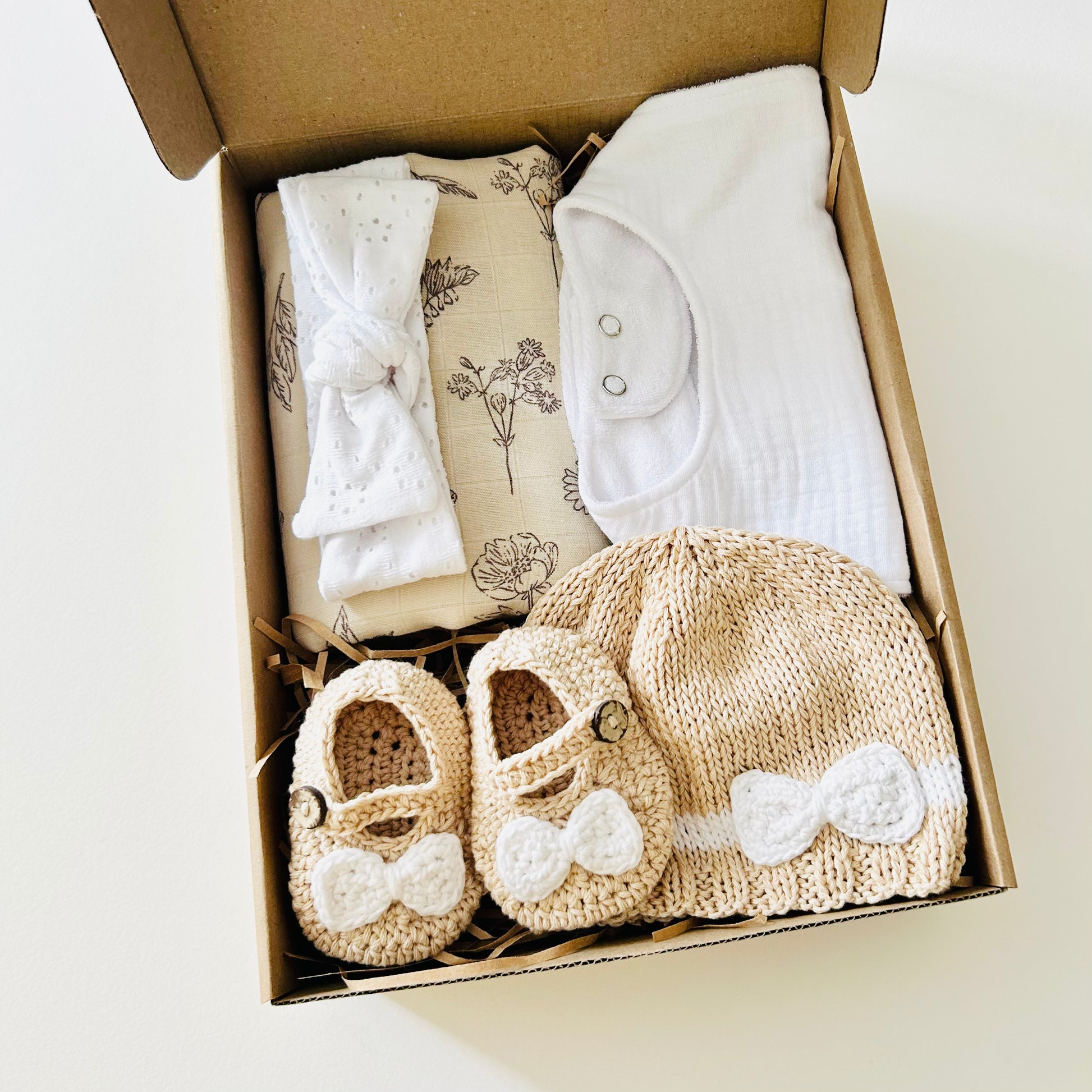 - Hand knitted bow beanie in biscuit and white. 100% natural cotton. Size: 0-3months.