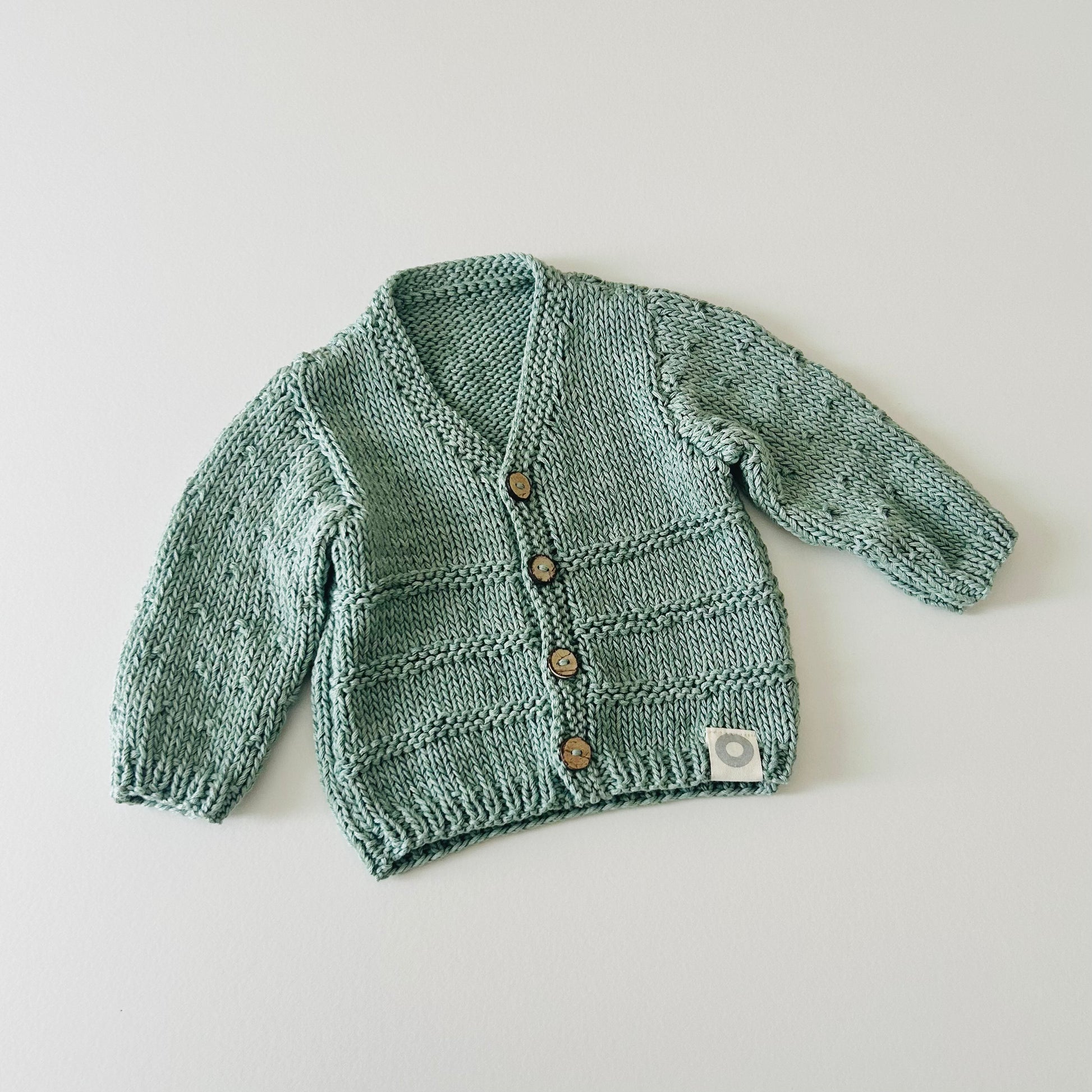 Hand knitted v-neck front open cardigan with wooden buttons. Features patterned sleeves and with knitted stripes on the front.